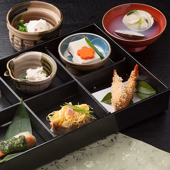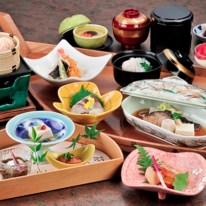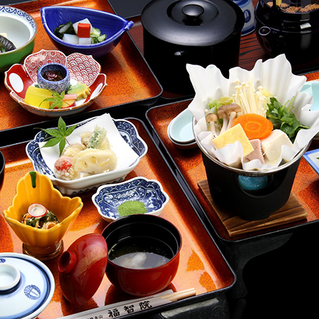 お食事は寺割烹「鎫阿」でのコース料理のほか、宿泊のお客様は箱膳懐石の部屋食からお選びいただけます。